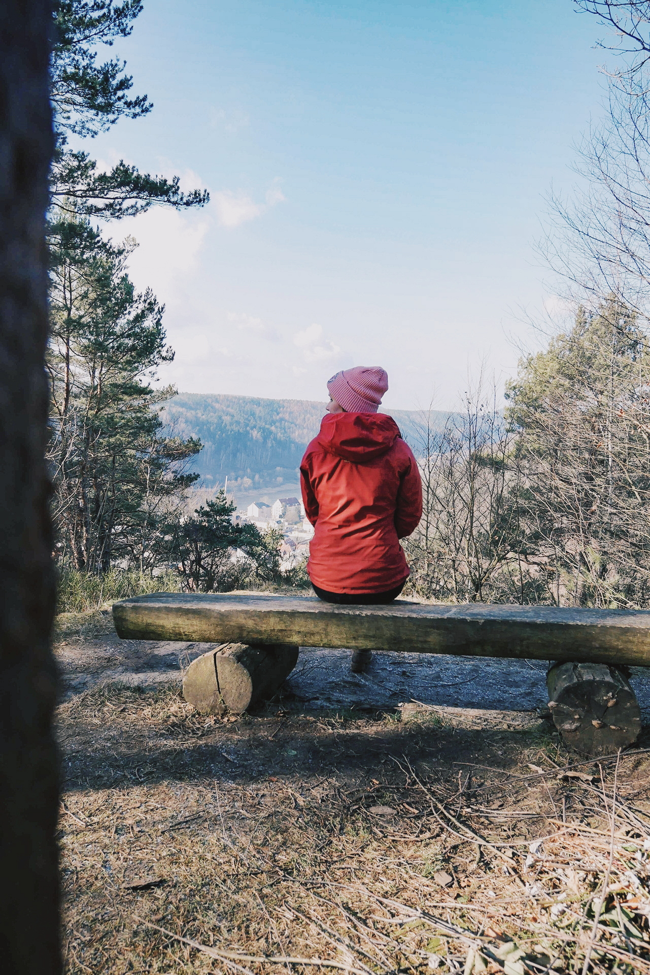 Ich wanderte bei mittlerem Anstieg durch einen Wald und es war unglaublich schön. Die Sonne stieg langsam höher und fiel zwischen den Bäumen hindurch auf den Waldboden. Nach nur kurzer Zeit erreichte ich den ersten Aussichtspunkt mit einem Blick auf Bad Schandau und die Elbe. Guter Moment für einen Schluck Kaffee aus der Thermoskanne.