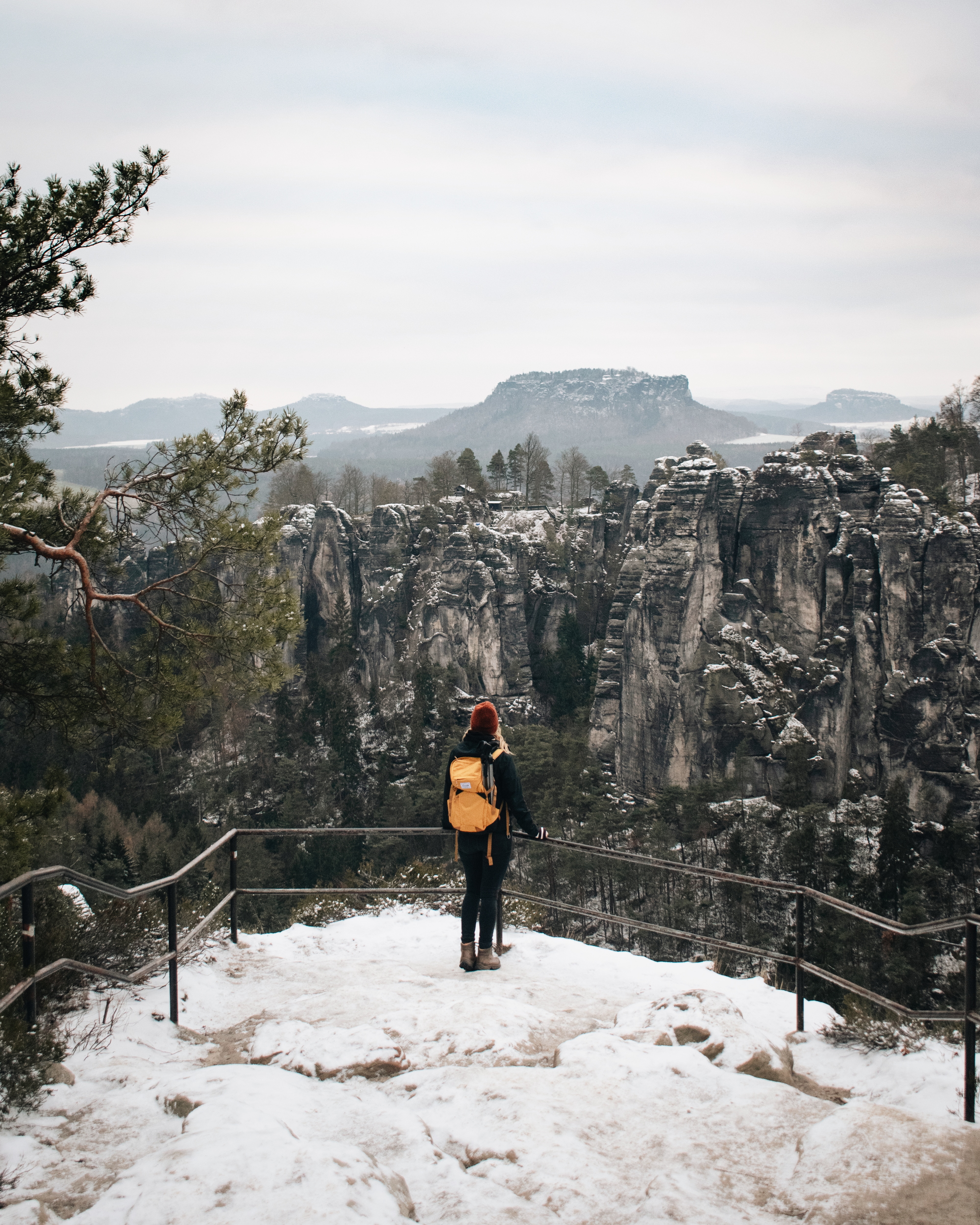 Es ging noch ein Stück weiter durch den Wald zur Wehlnadel, von wo aus wir nochmal einen tollen Blick auf die Basteibrücke hatten. Dort gab es dann auch endlich eine Tasse Kaffee! Da die -5°C allerdings keine wirklich gemütliche Stimmung ermöglichten, liefen wir bald weiter, um nicht festzufrieren.
