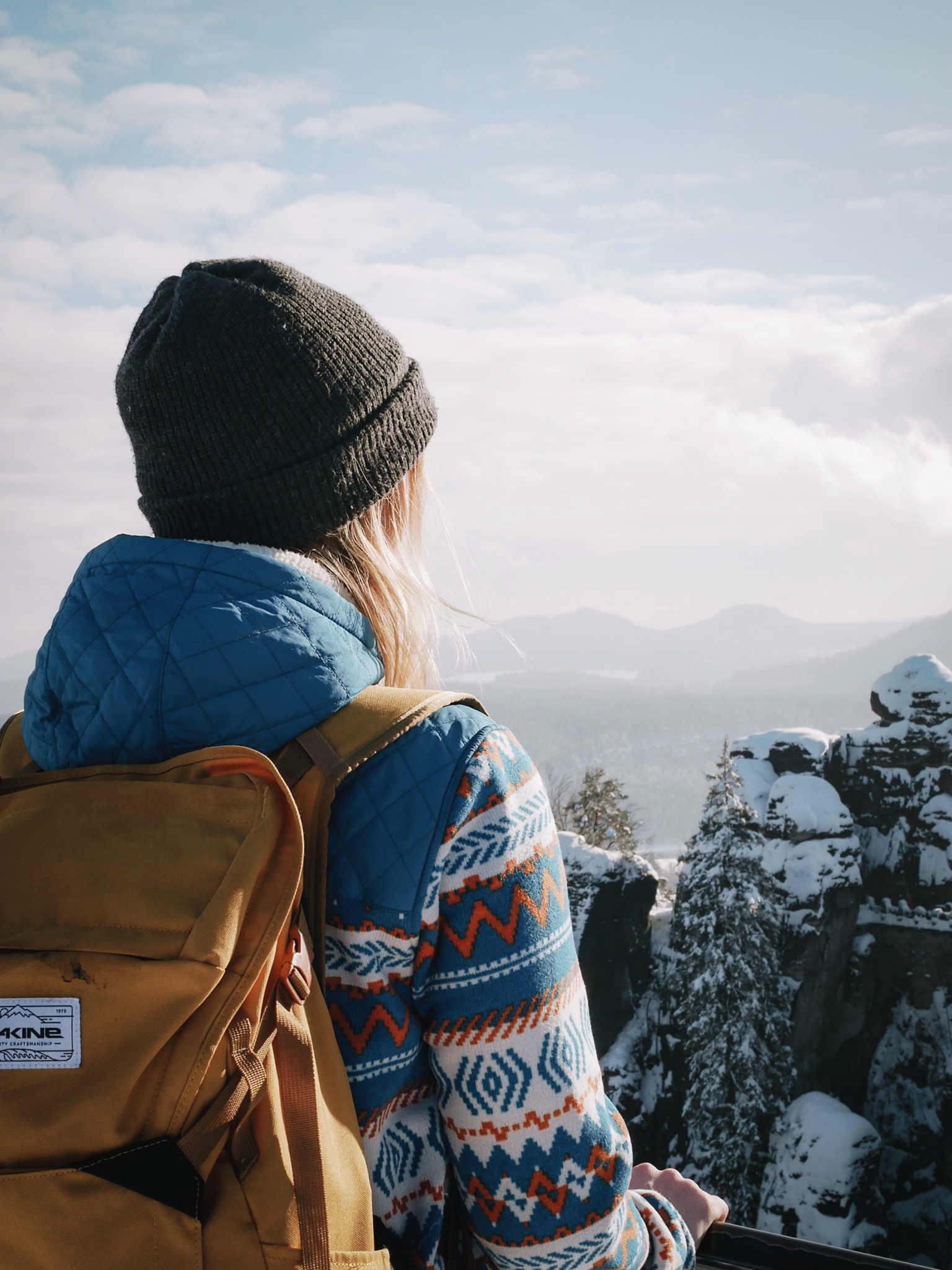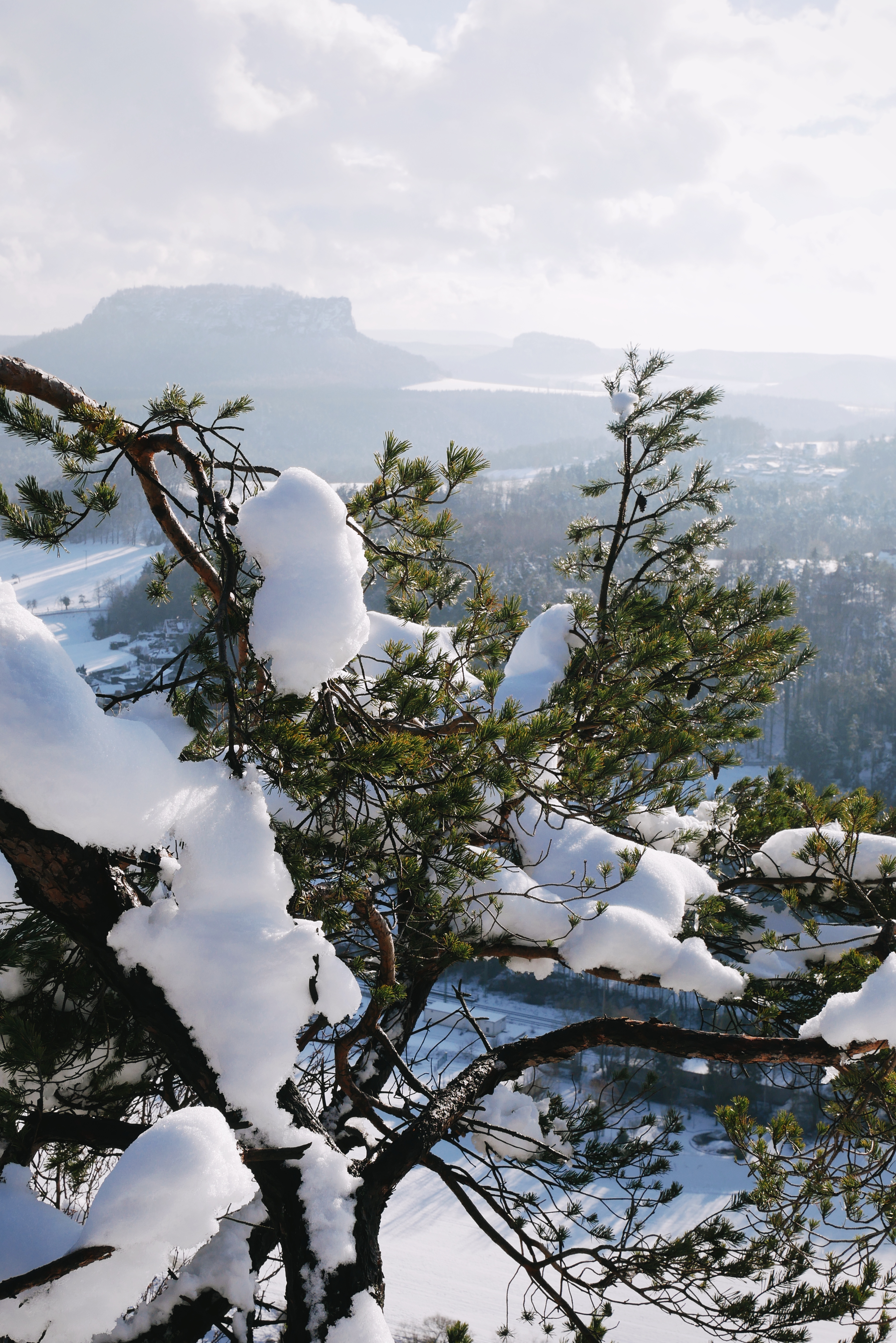 Ich lief weiter und erreichte die Aussichtsplattform gegenüber der Bastei. Als ich dort oben ganz alleine stand, den Blick auf die Bastei und die Hügel der Sächsischen Schweiz dahinter, kam die Sonne wieder hinter den Wolken hervor und ließ den Schnee auf den Felsen glitzern. Es war traumhaft schön und am liebsten wäre ich ewig dort stehen geblieben!