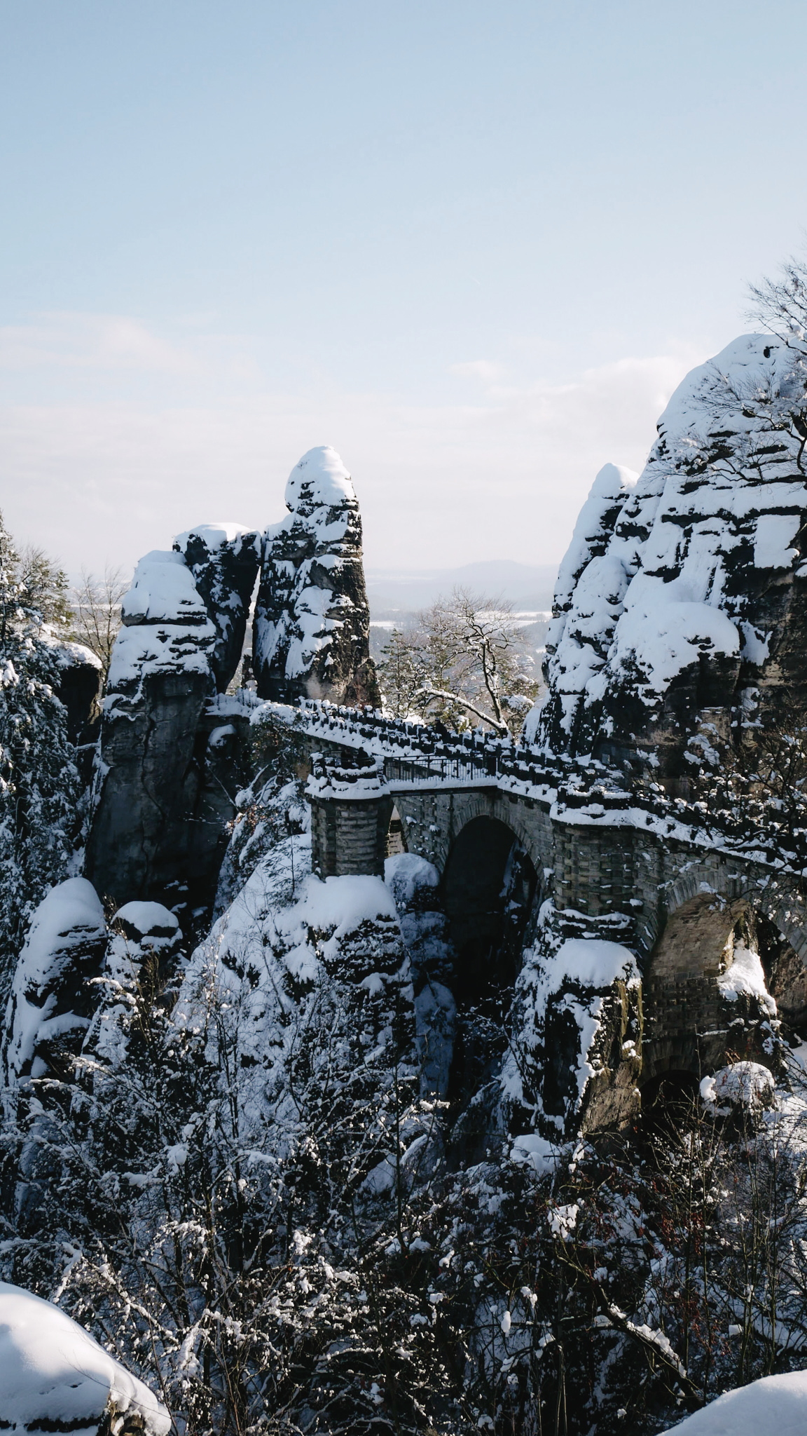 Gesagt, getan – ein paar Stunden später, am frühen Nachmittag, stapfte ich durch den Schnee hinauf zur Basteibrücke. Oben angekommen waren nur ein paar andere Menschen dort und ich tastete mich langsam vor und über die Brücke. „Vortasten“ ist hier das richtige Wort, denn der Schnee auf der Basteibrücke war von vorherigen Besuchern ganz platt getreten, sodass der Weg zu einer einzigen glatten Fläche wurde.