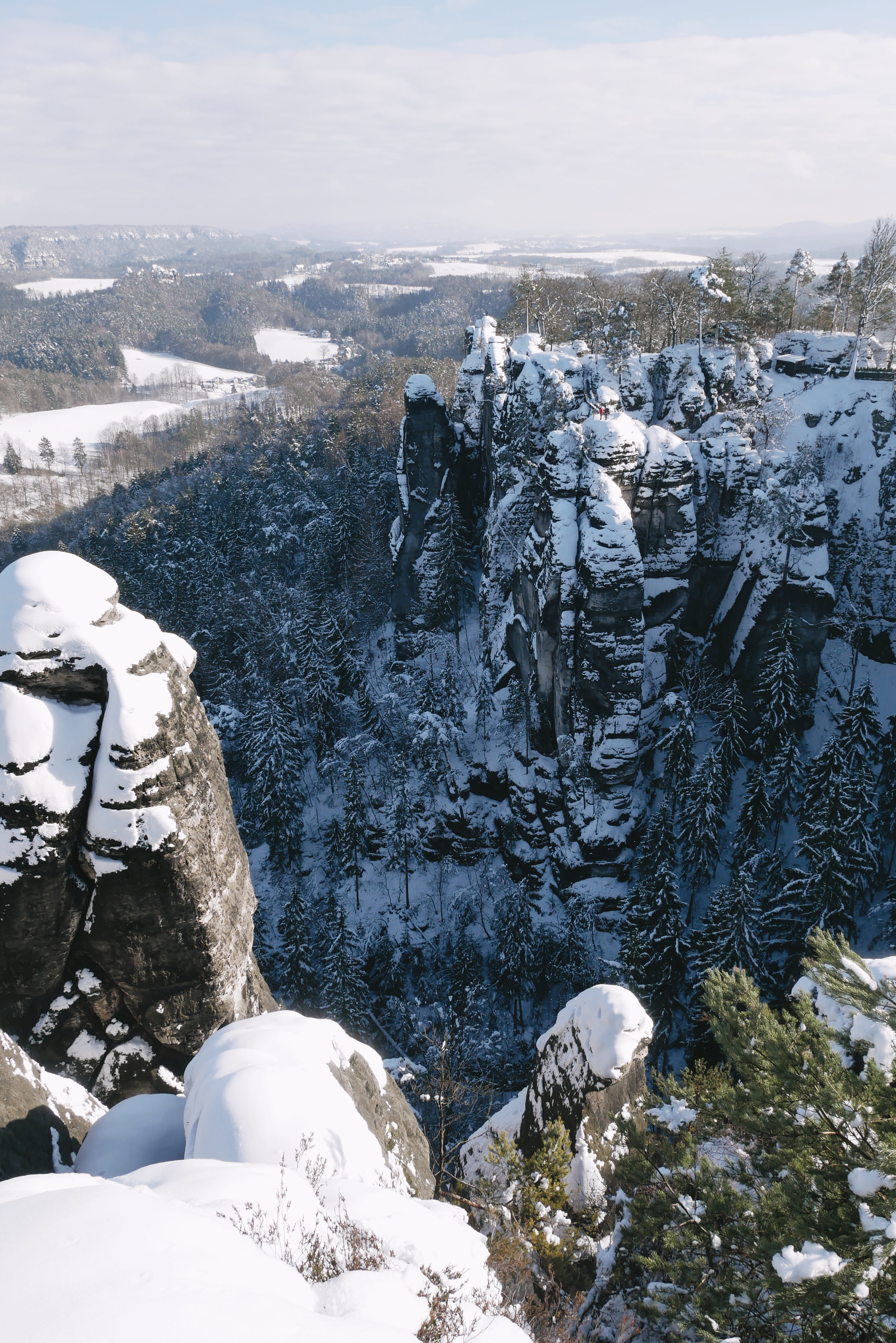 Ich lief weiter und erreichte die Aussichtsplattform gegenüber der Bastei. Als ich dort oben ganz alleine stand, den Blick auf die Bastei und die Hügel der Sächsischen Schweiz dahinter, kam die Sonne wieder hinter den Wolken hervor und ließ den Schnee auf den Felsen glitzern. Es war traumhaft schön und am liebsten wäre ich ewig dort stehen geblieben!