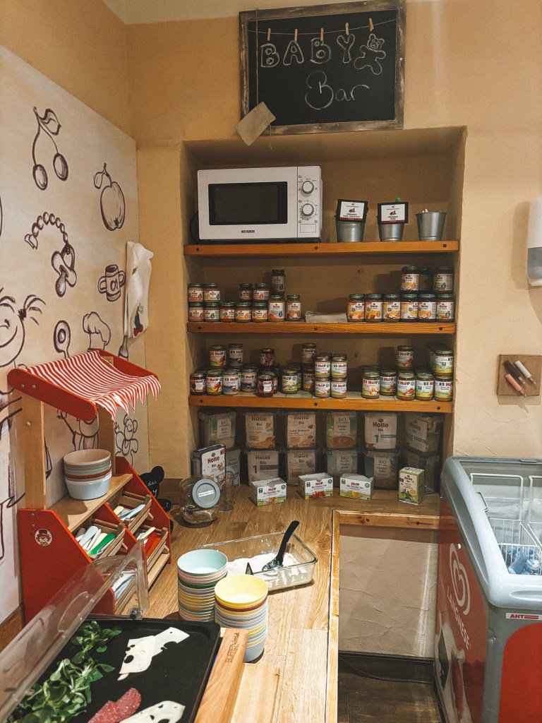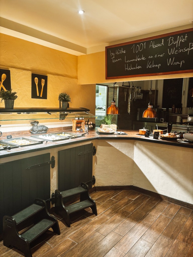 Was uns besonders begeistert hat, war wie sehr alles von vorne bis hinten durchdacht ist. Wir hätten theoretisch das meiste zu Hause vergessen können und wären trotzdem gut ausgestattet gewesen. Von Lätzchen und Besteck zum Mittag, über Sandspielzeug in jedem Buddelkasten bis hin zu Kinderwagen und Fahrradanhängern und Helmen. Alles da und kann kostenfrei von den Gästen genutzt werden. Das Mitdenken der kleinsten Gäste ist auch so an jeder Ecke erkennbar. Kleine Tritte und Hocker, damit sie selbstständig ans Buffet kommen oder auch einen Blick über den Rezeptiontresen werfen können, kleine Kindersessel neben den Sesseln für die Eltern und Taschntücher griffbereit, wenn man in den Essenssaal kommt. Im Einzelnen vielleicht scheinbare Kleinigkeiten, aber all das hat den Besuch für unsere Kinder zu einem Abenteuer gemacht und führte bei uns zu Entspannung, weil stets alles Wichtige griffbereit war. Außerdem finde ich es toll, wenn Kindern auch als gleichwertigen Gästen begegnet wird und sie das Gefühl vermittelt bekommen, auch mitwirken zu dürfen.